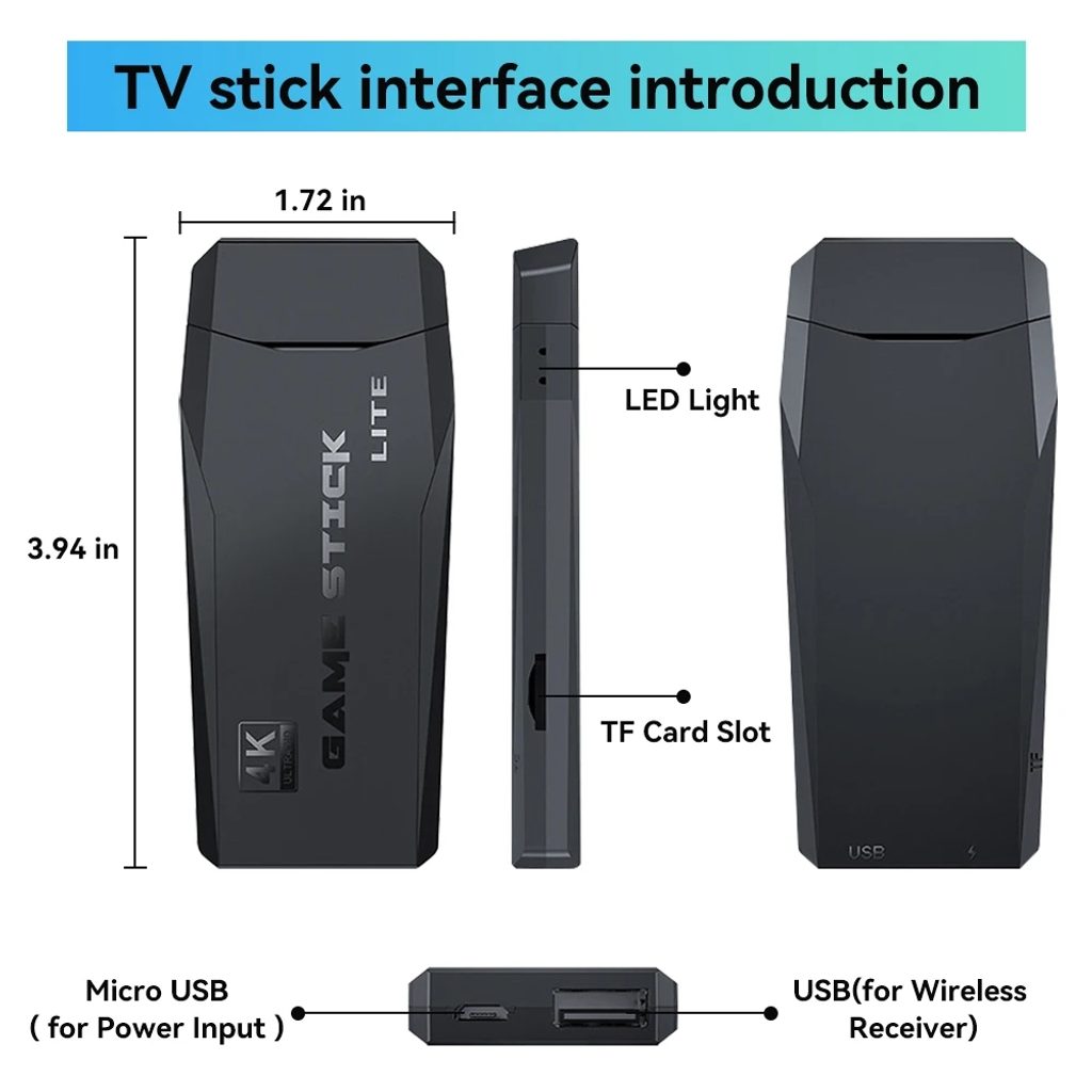 M8 Retro Game Stick Lite 4K přemění tvůj televizor na retro arkádu během několika sekund – stačí zapojit do HDMI, připojit napájení a můžeš hrát. Díky dvěma bezdrátovým ovladačům je ideální i pro hraní s kamarádem.