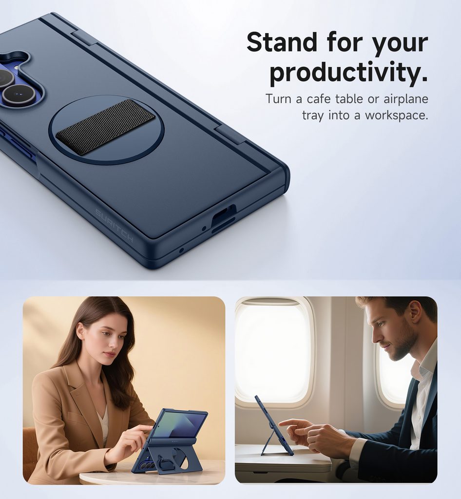 Vestavěný 360° otočný mechanismus vám poskytne naprostou volnost. Skrytý stojánek je v klidu téměř neviditelný, ale v případě potřeby nabídne stabilní oporu v rozmezí 0–102° – ideální pro sledování filmů, videohovory, online lekce i vaření. Díky otočnému držáku navíc zajistíte pevný a bezpečný úchop jednou rukou – ať už fotíte selfie, telefonujete nebo spěcháte s kávou po ulici.